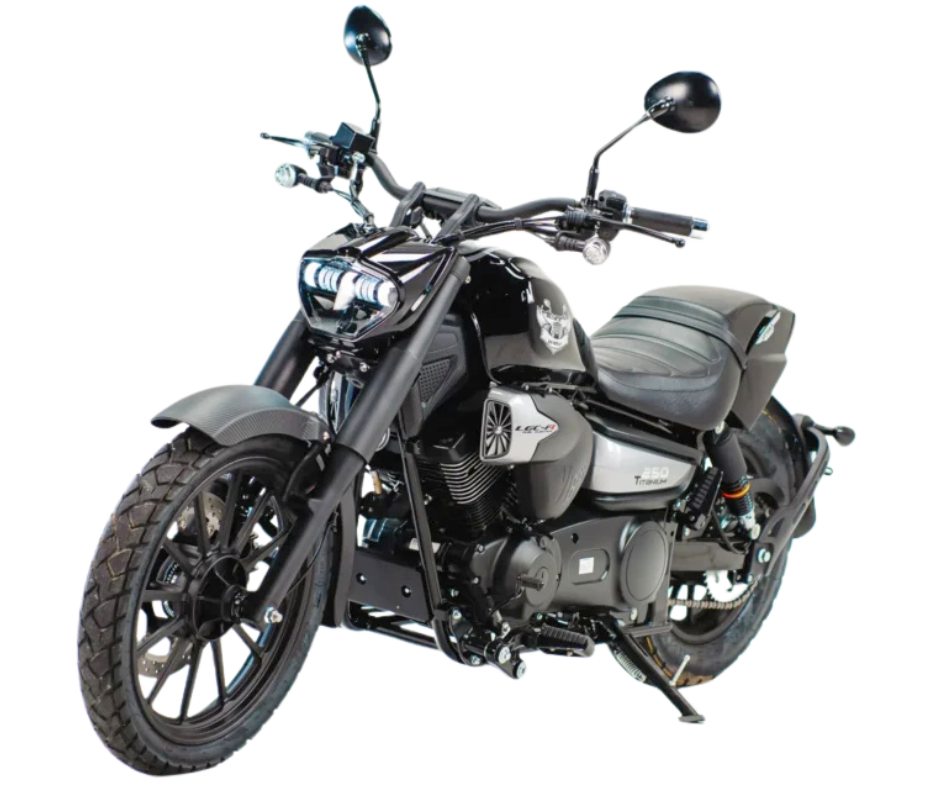 Estilo também é atitude! Pensada para despertar seu espírito livre, a Titanium 250cc possui design inovador, motor em V e o desempenho ideal para te acompanhar na estrada.